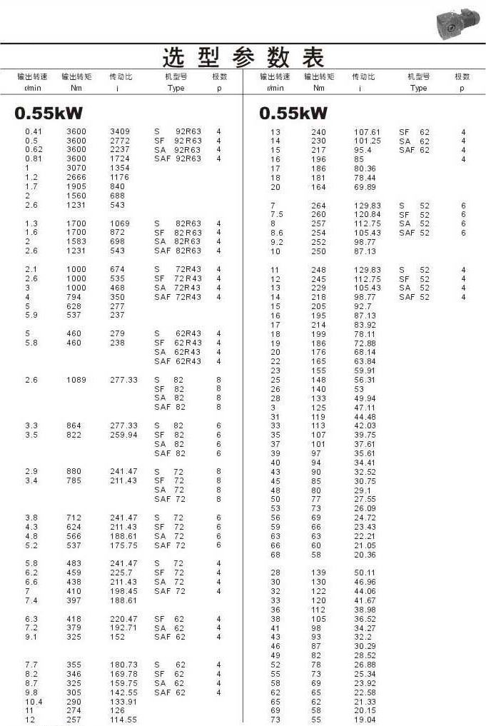 選型參數(shù)表0.55kW